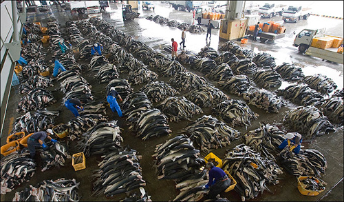 (オレ、イギリスにある七面鳥の養殖場で働いた事あるけど、この写真にあるフカヒレ工場と似たようなモンだったぜ。オレは日本人がヒレ以外の部分を捨ててるとは思えない。だってヒレが必要なだけなら、わざわざ全体を持って帰って来なくていいよな?しかも、サメがホントに絶滅寸前ならどうして年間7300万匹も捕獲されてるんだ?)今回ばかりはさすがに